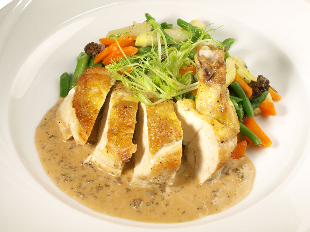 Toutes nos poitrines de poulet sont farcies avec des légumes de saison.